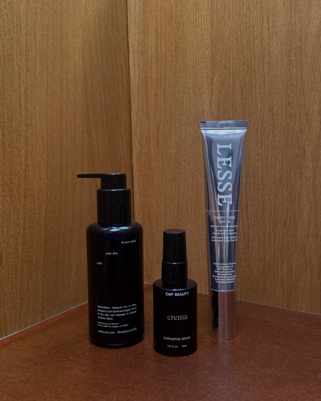 I love a low-time morning and evening sequence. In the evening, I always begin by cleansing with CAP Beauty’s Blue – it’s soothing, and my skin feels soft afterward. A few times a week I’ll massage in LESSE’s Refining Cleanser for gentle exfoliation. From there, I rotate between CAP Beauty’s Crema, LESSE’s Essential Moisturizer, or Marie Veronique’s Barrier Restore Serum. I like to keep variety, but with my sensitive skin, I stay loyal to the brands I know truly work. I’m also a devoted Yuka advocate, honestly a bit obsessive about keeping my ingredients clean without hormone disrupting ingredients – greenwashing is real, so I get really nerdy when researching ingredients before I buy a product. This app so easily explains what to avoid. In the mornings, I’ll add a serum from either Marie Veronique or CAP, followed by sun protection from LESSE or Marie Veronique. And lastly, I reach for Activist’s lip balm as it hydrates beautifully without adding shine.